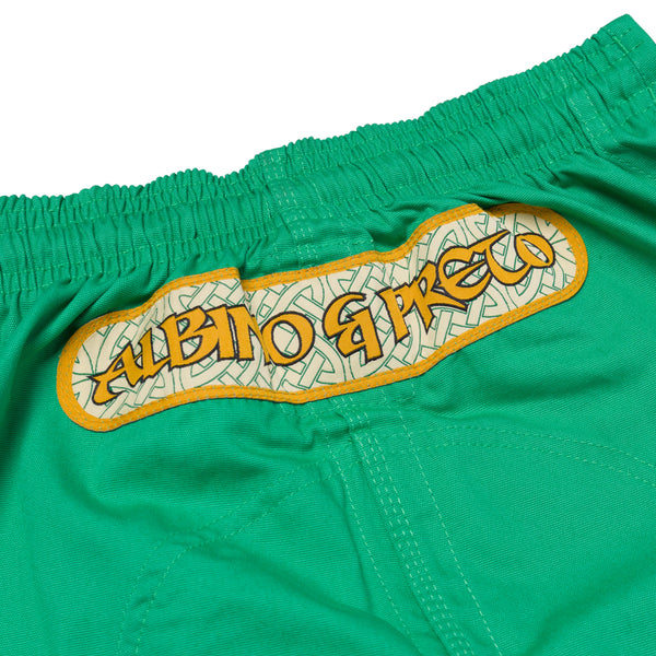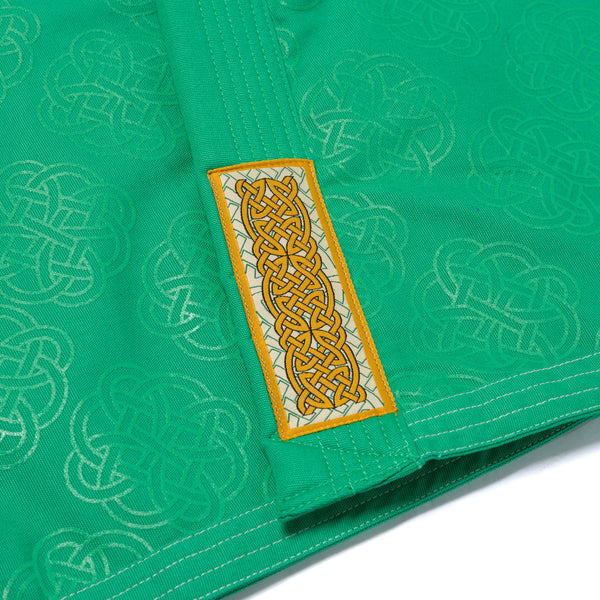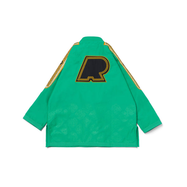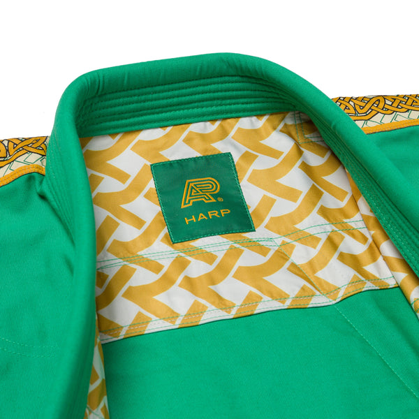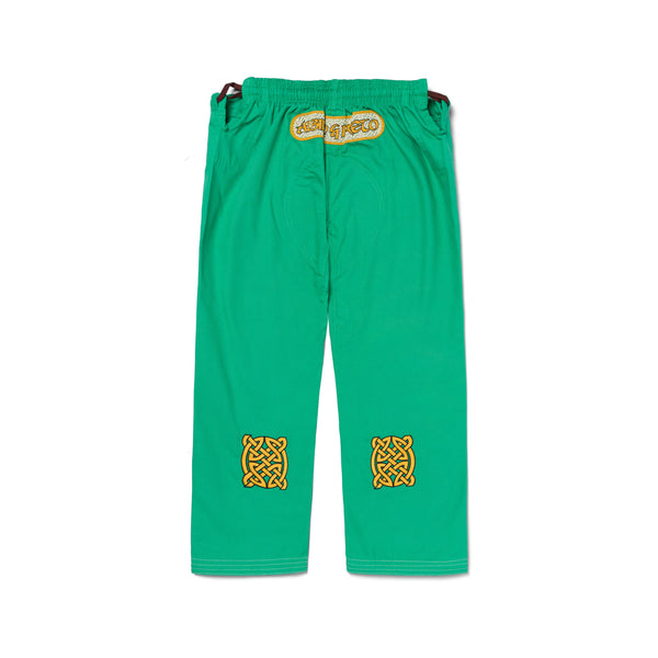Item Description Albino & Preto's "HARP (HEALTH AND RECOVERY PLAN)" workwear series is a collection that draws inspiration from Celtic iconography. Featuring a bold green gi made from ultra-durable lightweight ten-ounce cotton canvas. Decorated with gold Celtic motif patches and embroidery that take cues from the European late Bronze Age. The patches feature Celtic knots and insignia that pay homage to and celebrate Celtic history. These design elements are noticeable throughout the workwear uniform.