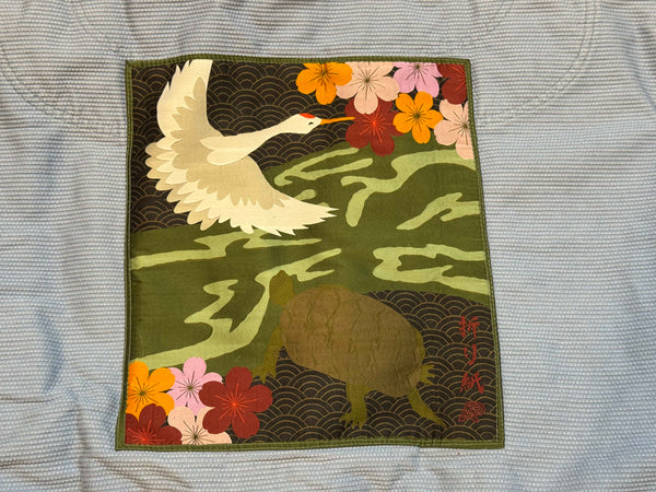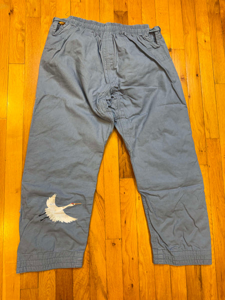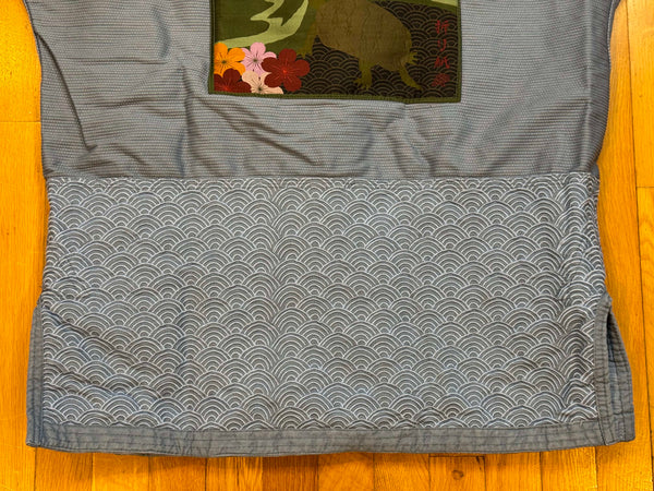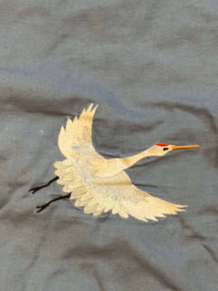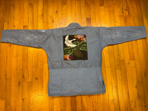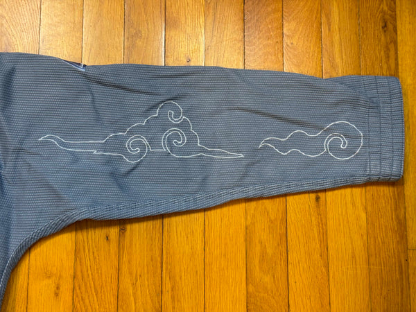 The sleeves of the kimono top feature an embroidered cloud design. The cloud also known as Kumo is symbol of hope just like the crane on the back of the kimono top. Other details on the top include a back woven patch with a crane and turtle which is a symbol of wisdom and longevity.