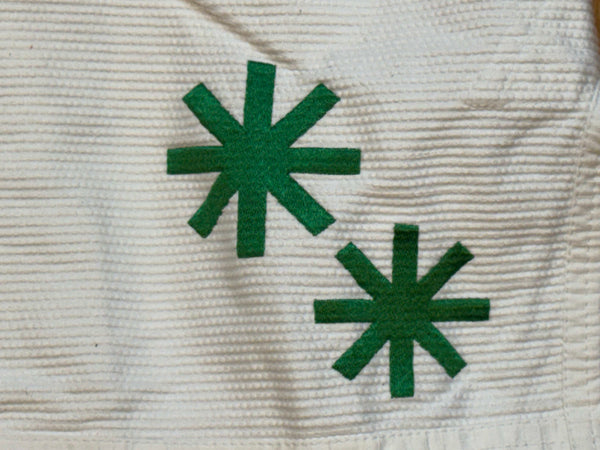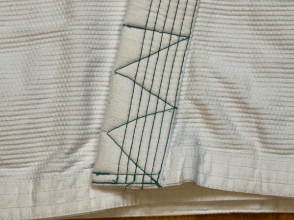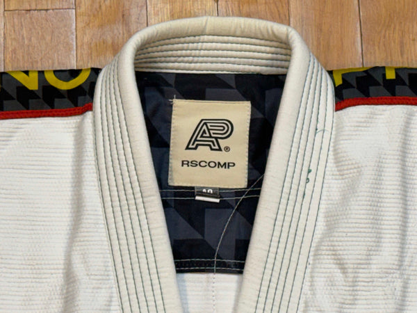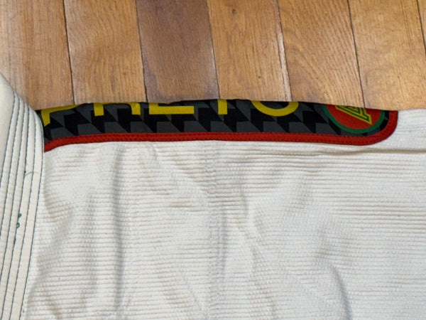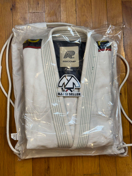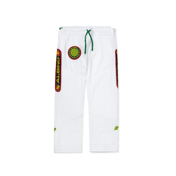 Labeled, RYBG, this RSCOMP martial arts uniform boasts the nation's colors of Red, Yellow, and Green. The RSCOMP series was designed for competition with a 400-gram pearl weave cotton kimono top and 10-ounce ripstop bottoms. Patches and embroider adorn the uniform's shoulders, skirt, backside(s), and pant side(s).
