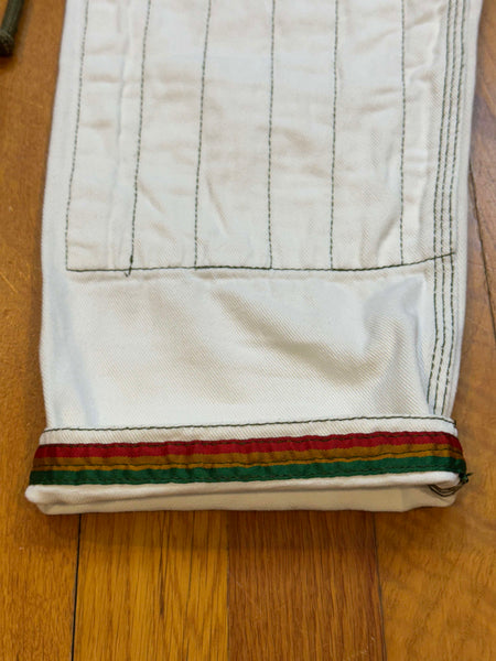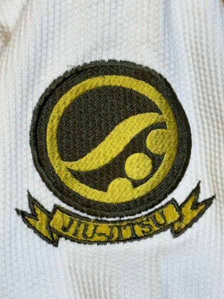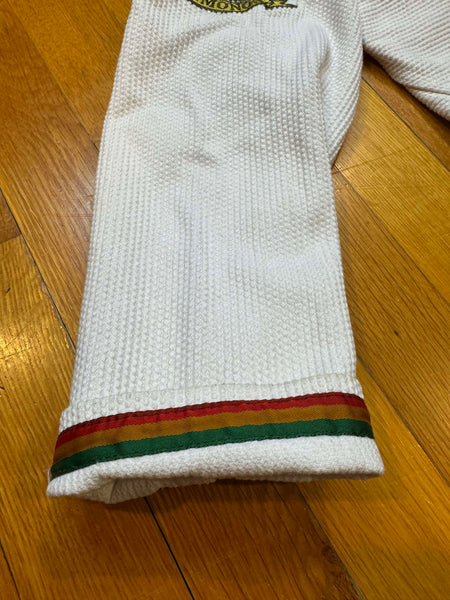 This gi does not include a bag. Has some small marks that should come out in the wash or with a light OxiClean treatment.