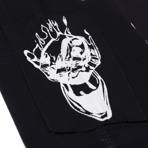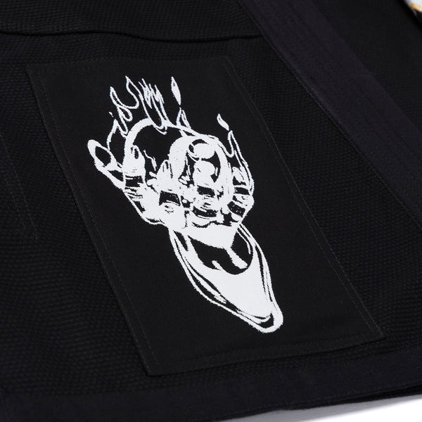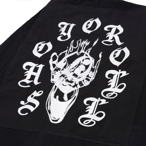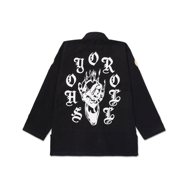 Gothic-style lettering and high-contrast iconography are at the forefront on the yooga Flame’s aesthetic, every detail designed with intent—pushing beyond convention while maintaining function and wearability.
